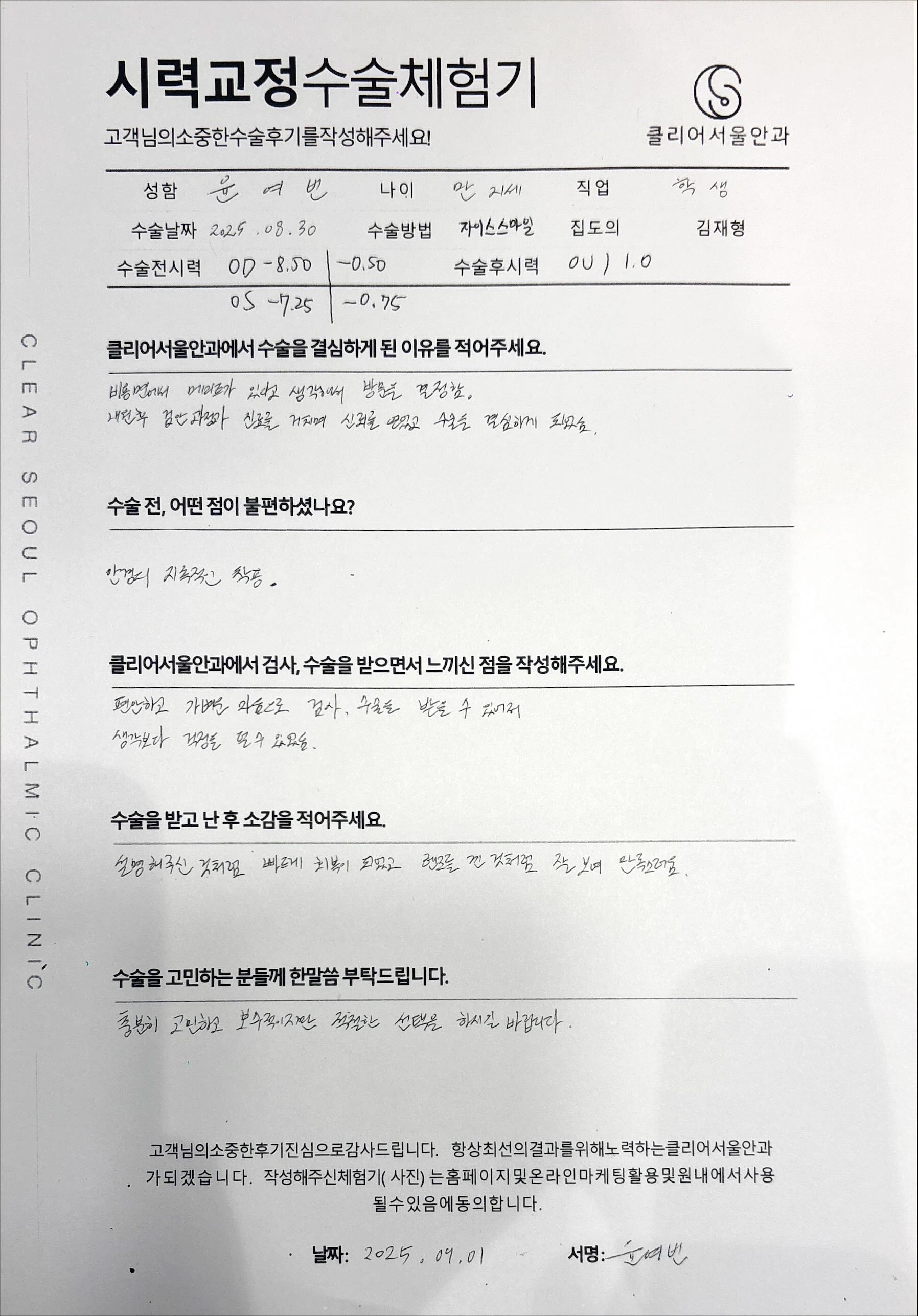 수술 전 도수(좌/우) L) -7.25 -0.75 / R) -8.50 -0.50 수술 후 도수(좌/우) 양안)1.0