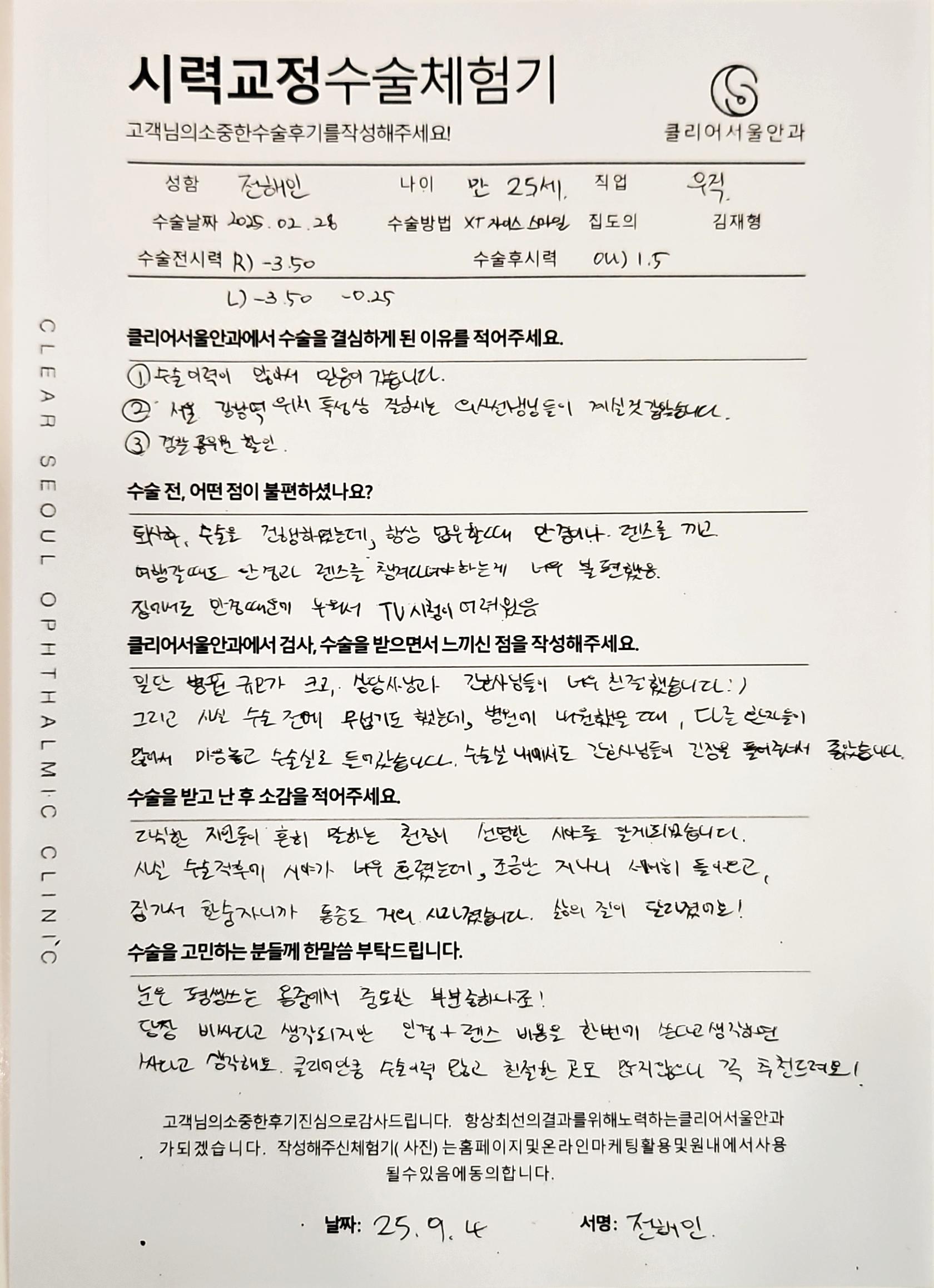 제목 [커스터마이징 자이스스마일] 수술 이력이 많아서 믿음이 갔습니다. 무섭기도 했지만 다른 환자들도 병원에 많아서 마음이 놓였어요. 선명한 시야를 알게 됐고, 삶의 질이 달라졌습니다. 눈은 평생 쓰는 중요한 부분 중 하나이니 수술 이력 많고 친절한 클리어 서울안과 추천드립니다! 작성일 2025-09-04