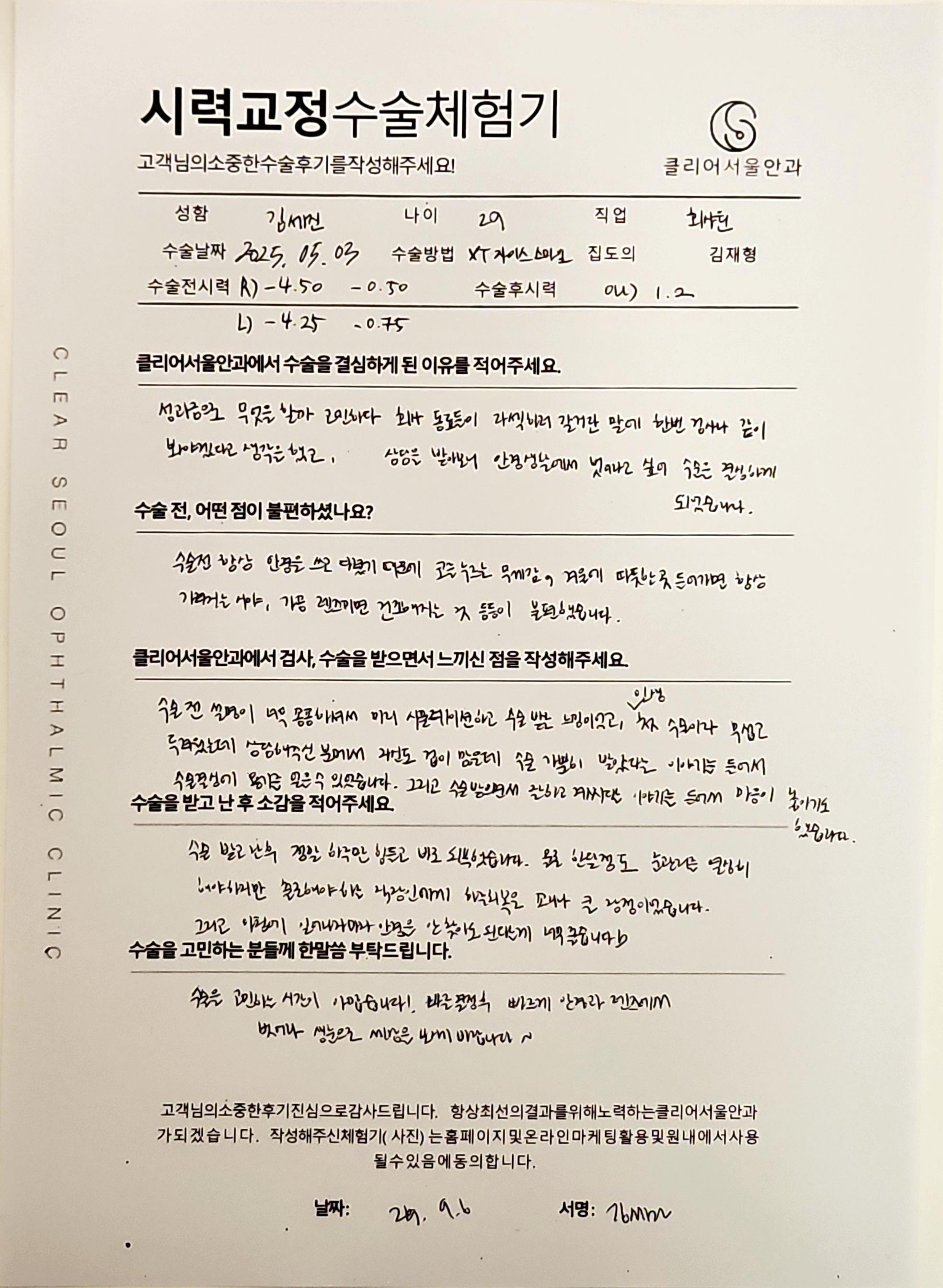 제목 [커스터마이징 자이스스마일] 안경에서 벗어나고 싶어 수술을 결심했습니다. 수술 전 설명도 꼼꼼하고 수술 중에도 계속 잘하고 있다 해주셔서 마음이 놓였어요 빠른 회복은 직장인에게 꽤 큰 장점입니다. 시간이 아깝습니다!! 안경과 렌즈에서 벗어나 생눈으로 세상을 보시길 바라요! 작성일 2025-09-08
